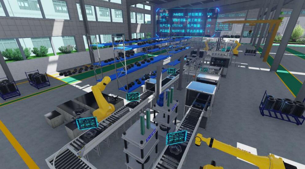 對物理車間進行三維建模,包括產線、立庫、物流、電子看板、操作人員、中央控制室等,定義設備仿真交互屬性,采用輕量化技術保證大規模場景的流暢顯示,從而建立一個與實際環境1:1的虛擬工廠環境。